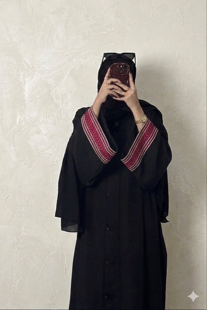 Designed for the modern woman, this abaya features a sleek front-open silhouette paired with striking embroidered sleeves in rich maroon tones. The detailed pattern adds depth and character, making it the perfect blend of minimal and statement style.